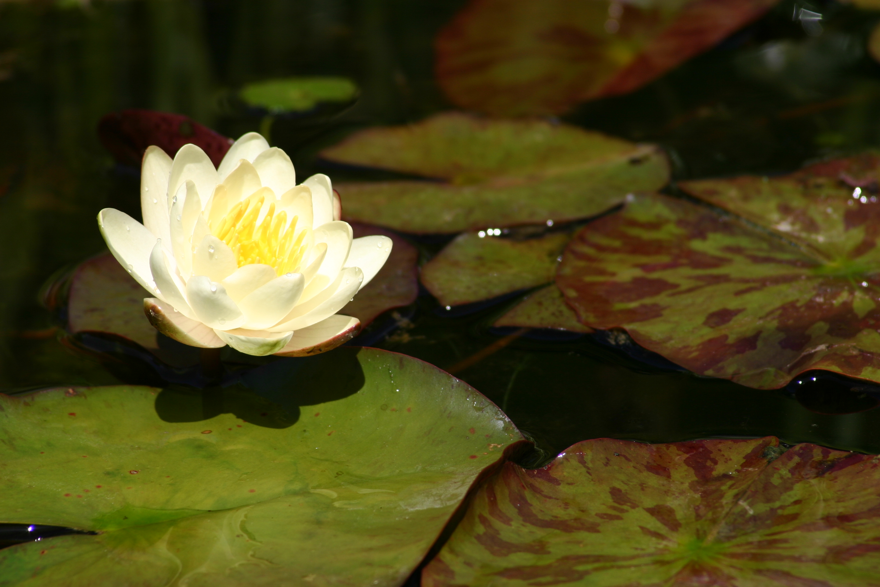 Huge, fragrant, sun colored blossoms with long, narrow curved petals rise slightly above equally large forest green leaves red flecked cocoa beneath to make Sunrise an outstanding addition to anyone’s waterscape. An excellent bloomer, Sunrise adjusts well to semi-shade. |