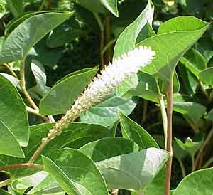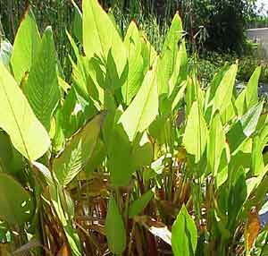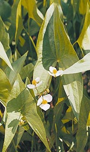 It’s not hard to see how this perennial got its common name. All you have to do is examine a green leaf. Its three highly defined grass-green points look like an arrowhead. During the summer you’ll be further intrigued by this unique plant for it produces numerous tiny, three-petaled, mild-white blossoms accented with banana yellow centers and soft rose around the lower part of the blooms. Found in shallow ponds, rice fields and along streams in most areas of the world, the Japanese Arrowhead thrives in wet soil or in water not deeper than six inches. It rarely gets taller than three feet. (Deciduous) |