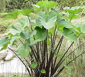 Violet Stem Taro is a real beauty in the pond. A moderate grower so it does not require a lot of work. Deep, deep, green leaves with dark violet stems, very prominently holding these deep green arrowheads. Very tropical so it will require protection from frost. Poi is made from the original Taro in Hawaii. Taro has oxalic acid in them which is very dangerous so you need to know how to make poi, DON'T DO IT ON YOUR OWN. The plant on its own is not dangerous and as you can see is grand in stature. |